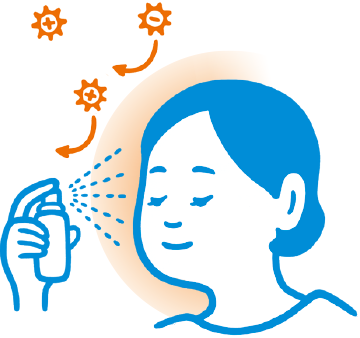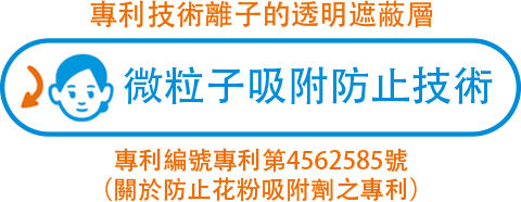 添加專利技術成分與新阻絕成分的透明遮蔽層可抑制花粉等微粒子附著。只要快速一噴,就能抑制花粉、PM2.5、病毒附著於肌膚與頭髮。