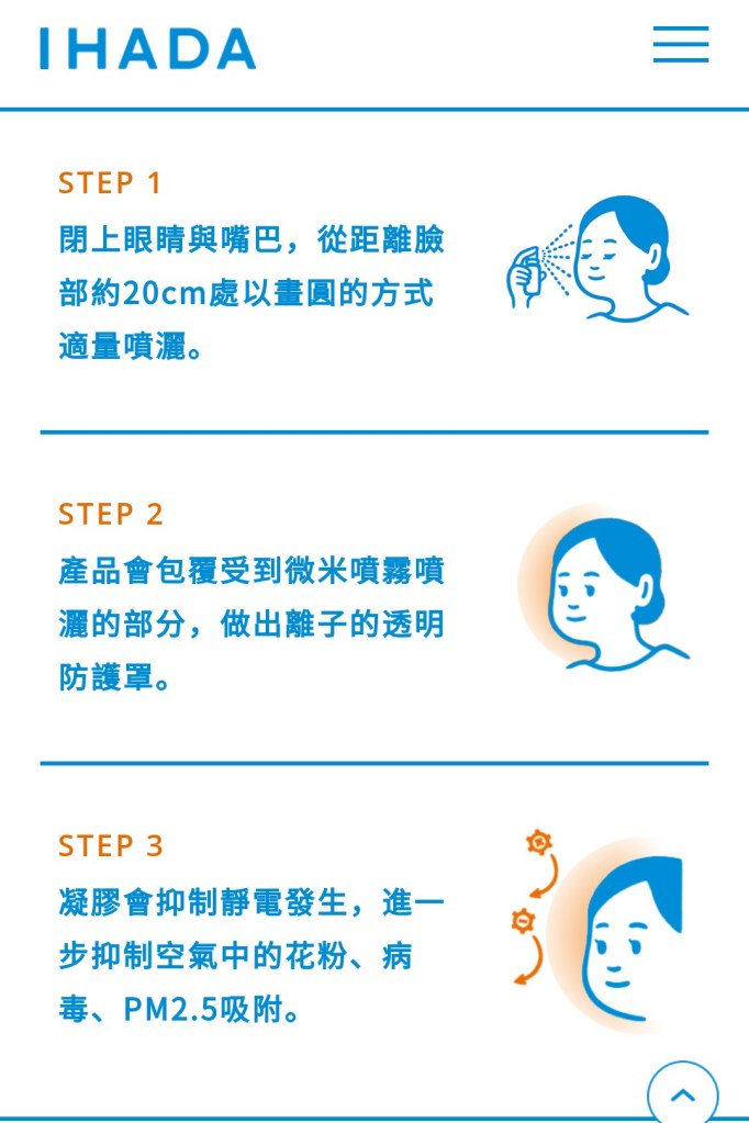 產品特色 特色1 專利技術「微粒子吸附防止技術」 會透過離子的透明遮蔽層 抑制花粉等物質附著 採用資生堂專利技術「微粒子吸附技術」的成分將阻絕花粉、PM2.5。而且ALLER SCREEN EX還能連病毒都阻絕! 特色2 化妝後也能使用的簡單噴霧型 添加天然溫泉水的細微噴霧粒子會平均散佈在肌膚與頭髮上,發揮阻絕的效果。 特色3 講究的產品設計 ○添加天然溫泉水 ○全家皆可使用(6歲以上)○經過皮膚過敏試驗 ○無添加防腐劑(對羥基苯甲酸酯) 使用方式 請以四小時左右為間隔,一天使用3~5次。 不需搖晃使用時噴頭在上 STEP 1 閉上眼睛與嘴巴,從距離臉部約20cm處以畫圓的方式適量噴灑。 STEP 2 產品會包覆受到微米噴霧噴灑的部分,做出離子的透明防護罩。 STEP 3 凝膠會抑制靜電發生,進一步抑制空氣中的花粉、病毒、PM2.5吸附。