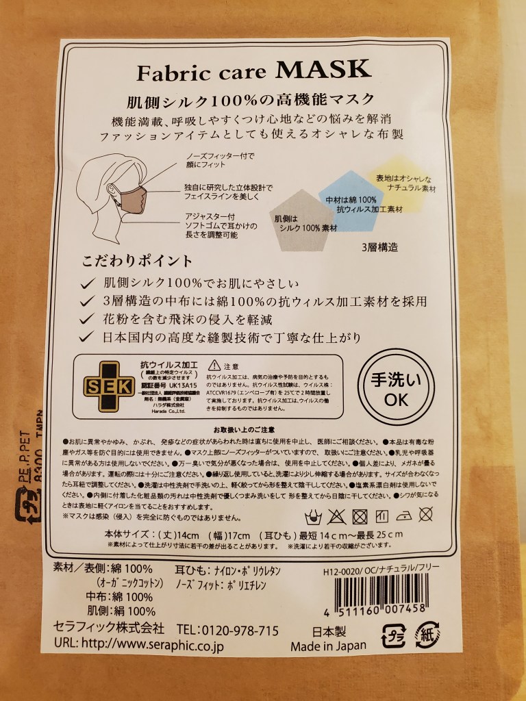 ●材質表:棉100%(有機棉)裏布:100%棉肌膚側:100%絲綢耳繩:尼龍聚氨酯鼻罩:聚乙烯
